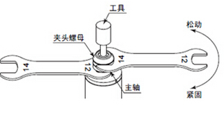 2,在夹头螺母上套上附带的14mm扳手朝逆时针方向转动,夹头松动后取下工具。(转动约1圈夹头螺母可紧固1次,再次转动后夹头被打开。)