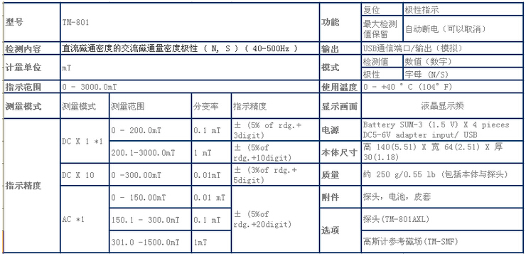 除了TM-701高斯计、TM-601高斯计的原有功能外,新机TM-801高斯计具有新的输出功能、充电接口、USB接口。