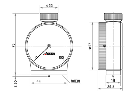 日本ASKER邵氏硬度计A型,是比较常用的橡胶硬度计型号,适用于一般橡胶硬度测量,shore A(20-90度),押针高度2.5mm,押针形状锥形,端面φ0.79mm,加压面形状44*18长方形。