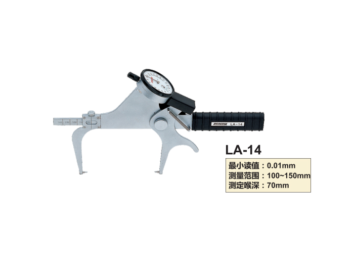 孔雀peacock带表外卡规LA-14,测量范围100-150mm,精度0.01mm,测定喉深50mm,指示误差±0.03mm。春亨工具代理品牌,原装进口。