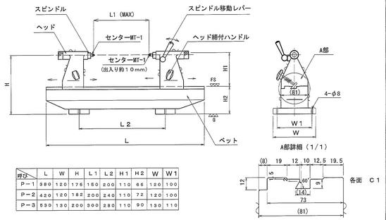 型号 | 台长(㎜) | 台宽(㎜) | 台高(㎜) | 中心距(㎜) | 可测直径(㎜) | 台面平行度 | 台面/中心测定面平行度(μ) | 中心顶针/测定面平行度 | 使用 | 重量 |