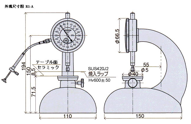 型 号 | 标准参数 | 指示误差 (um) | 测定台直径 (mm) | 测头直径 (mm) | 測定力 | 测量深度 (mm) | 有效测定范围 (mm) | 高度 (mm) | ||