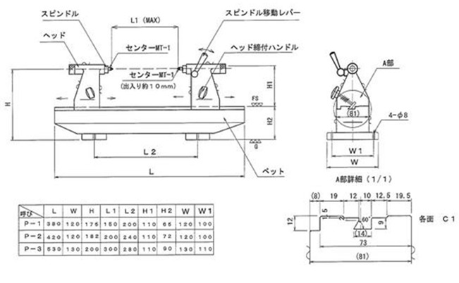 型号 | 台长(㎜) | 台宽(㎜) | 台高(㎜) | 中心距(㎜) | 可测直径(㎜) | 台面平行度 | 台面/中心测定面平行度(μ) | 中心顶针/测定面平行度 | 使用 | 重量 |