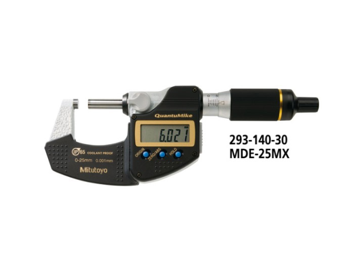 日本三丰mitutoyo数显外径千分尺,货号:293-140-30,型号:MDE-25MX,QuantuMike (快进千分尺),IP65防冷却液等级,进给速度达到2mm/rev,测量范围0-25mm,分辨力0.001mm。单手握持即可在同一测量时间内实现6步测量,与传统千分尺相比,定位时间和测量时间可分别降低60%和35%。