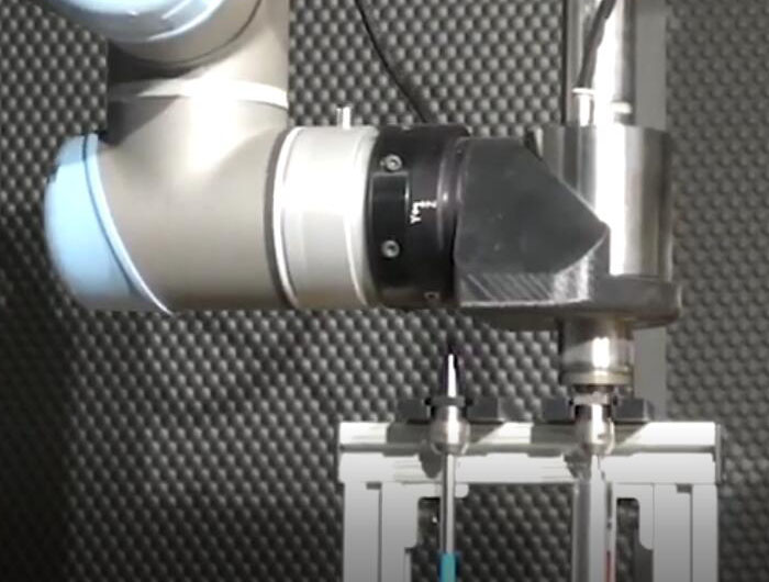 铝铸件去毛刺,不仅要去除外表面毛刺,还要去除内孔毛刺,因此同一件工件需要更换不同的研磨耗材,视频中,就是在小型机械臂上加装NAKANISHI自动换刀电主轴NR3060-AQC的加工视频。