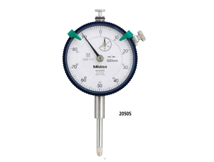 日本三丰mitutoyo指针式百分表2050S,测量范围20mm,精度0.01mm,带耳后盖型。长行程型指针指示表,防水型指示表具有57mm外径的前框,所有型号都有限值爪和紧锁装置,扇形齿轮使用特俗合金,提高了耐磨性。