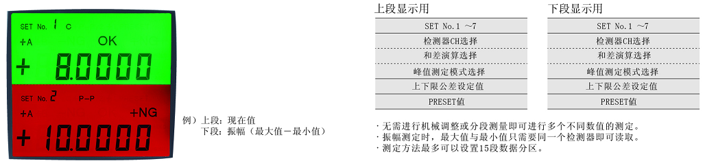 可分别进行各检测器之间独立的检测及显示。 上段、下段可分别进行测定条件设定、公差设定等7种条件设定。