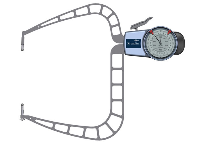 德国kroeplin指针外径卡规D4150,指针外径卡规,测量范围为100.00mm-150.00mm,测量深度:167mm;测点形式为球形Φ3,用途为:外径测量!