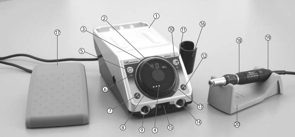 1.机体电源 2.转速调整盘 3.转速显示 4.LED 负荷显示灯 彩博8885.反转按键 6.反转LED 显示灯 7.开关按键A 8.打磨笔A 启动LED 显示灯 彩博8889.打磨笔连接插口A 10.转速固定 彩博88811.转速固定LED 显示灯 12.开关按键B 13.打磨笔A 启动LED 显示灯B 14.打磨笔连接插口B 彩博88815.电源开关 16.打磨笔放置插架 彩博88817.脚踏开关(选配) 18.打磨笔 19.按键开关 20.打磨笔放置架 |
