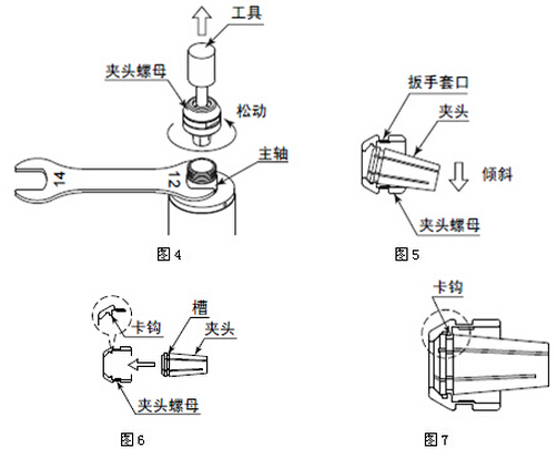 2,用手拿住夹头螺母,将夹头朝扳手套口方向倾斜的话,夹头就能取下。如果不能取下夹头时,可将夹头朝另一个扳手套口方向倾斜。(图-5)