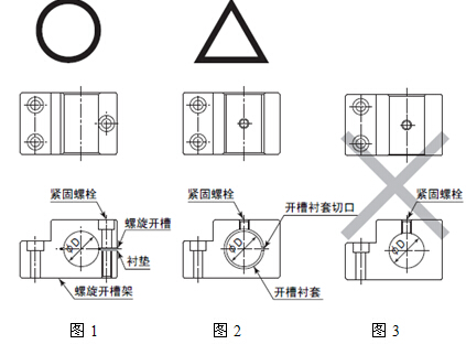 有关安装支架上时,如图-1所示建议使用螺旋开槽支架安装方法。如果图-1的方法不能安装时,请按照图-2的方法进行安装。 如图3所示直接安装螺丝时,会使主轴外套变形造成旋转不良或发热的原因. |