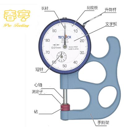 厚度计是使用百分表或者千分表连接到夹具然后使用。厚度计通过手持夹在测头和砧之间的工作,可以直接读出测量值。升降杆降低进行测量,释放时回到零点,在很短的时间周期来测量。