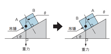 对于水平面的倾斜角度为θ。在此斜面上放一块有吊锤的板。这样斜面到直角的延长线与板的 A 侧只有θ吊锤倾斜角度。将板调转 180°, 斜面到直角延长线与板的 B 侧只有θ吊锤倾斜角度。因此即使没有绝对的基准(斜面与直角的延长线),倒转 180°角度便可得出 2× θ。 2× θ的一半便是θ,也可得出水平面。得出水平后假设为 0, 正因为如此掉转 180°时可以表示出实际倾斜角的 2 倍。表示的 2 陪的值的 一半便是倾斜角度,通过调整(斜面)被测量物将表示的一般的值变成 0,就成为水平。相反,有可能使用了原本有绝对基准的物体,因 为什么原因未能发现它有故障而误用。