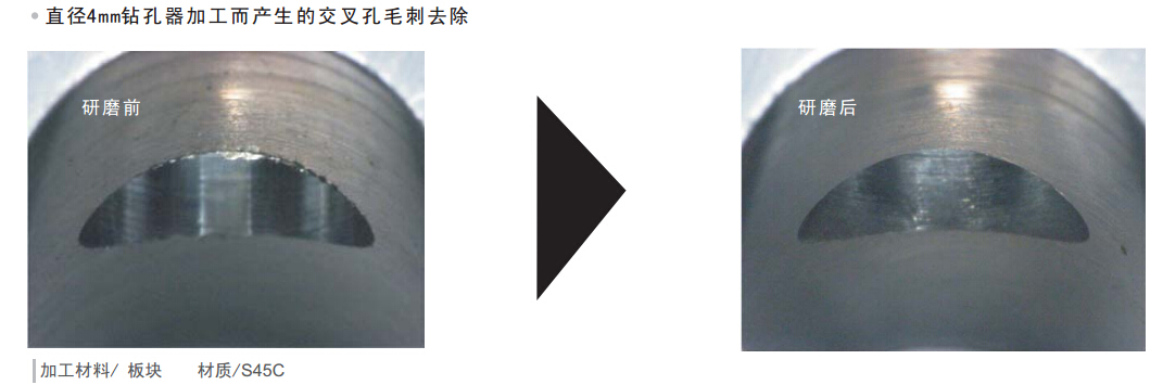 由于旋转的离心力,会扩大刷子,在刷子的前端有研削力,去除圆筒内的交叉孔细微毛刺。