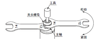 2,在夹头螺母上套上附带的14mm扳手朝逆时针方向转动,夹头松动后取下工具。(转动约1圈夹头螺母可紧固1次,再次转动后夹头被打开。)