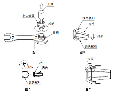 2,用手拿住夹头螺母,将夹头朝扳手套口方向倾斜的话,夹头就能取下。如果不能取下夹头时,可将夹头朝另一个扳手套口方向倾斜。(图-5)