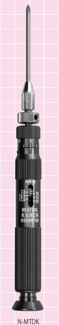 N-MTDK是一种超小型空旋式扭力起子,超出预设扭力时,会自动空转。 可以正确的测量精密仪器等螺丝的扭矩值,实施正确的紧固作业。 导入了筒夹式结构方式,能牢牢固定住螺丝起子头。有效的防止了其 脱落及丢失。 细长形、重量仅30克的构造,即使是精密性的操作也不会感到疲劳。 最适合钟表、照相机、医疗器械、电子仪器、手机、笔记本/IPAD平板 电脑等小型精密仪器的装配。 测量范围:7.5-80mN.m |