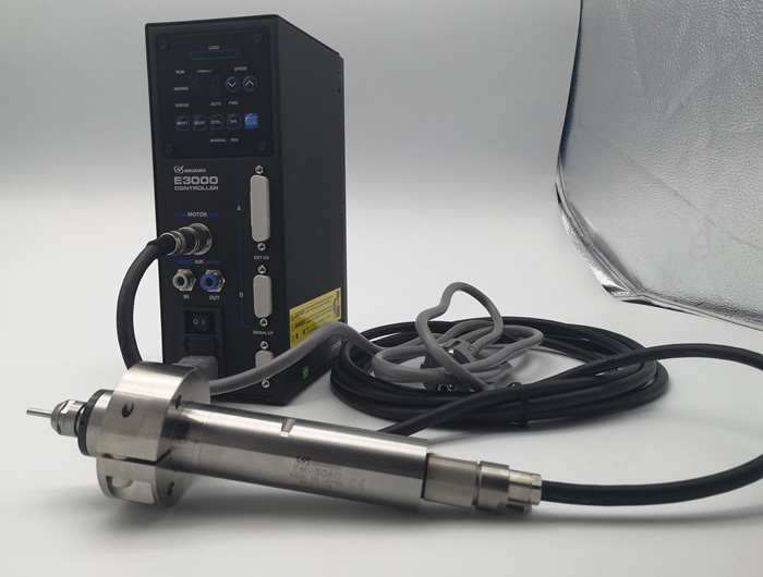 图为NAKANISHI高速电主轴NR-3060S+电主轴马达EM-3060+E3000控制器+电源线+夹具GR-30整体组合而成。可用于CNC加工中心、数控车床、PCB分板机、排刀机、各种非标设备或者机械臂上使用,转速高达6万转,可调速,跳动精度1μm,输出功率350W,铣削、钻孔、倒角去毛刺、切割等均可使用。