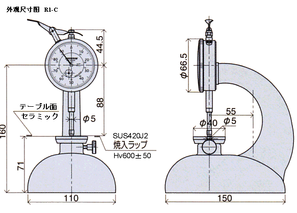 型 号 | 标准参数 | 指示误差 (um) | 测定台直径 (mm) | 测头直径 (mm) | 測定力 | 测量深度 (mm) | 有效测定范围 (mm) | 高度 (mm) | ||