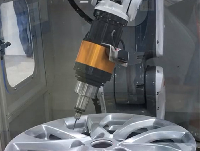 汽车轮毂浮动去毛刺解决方案,是在机器人末端加装NAKANSIHI浮动电主轴,由NAKANISHI自动换刀电主轴NR3060-AQC搭配日本FT浮动打磨头AF-30彩博888组成,有自动换刀功能,满足汽车轮毂多种加工刀具的需要。