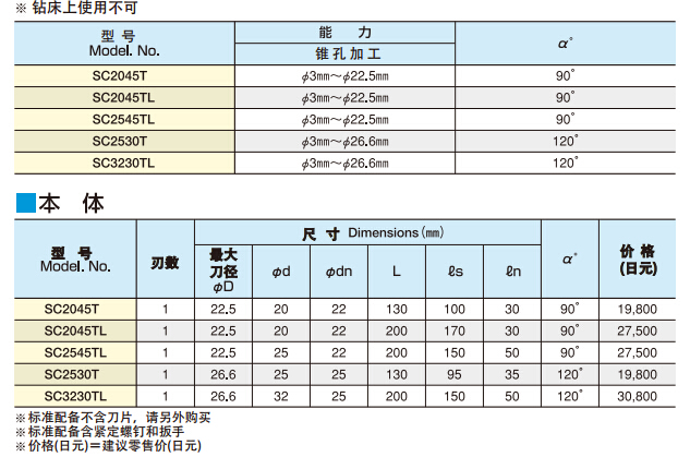 最大刀径22.5mm(90°),26.6mm(120°)