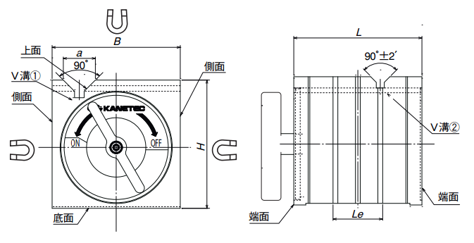 磁性块有三面可以用来吸着工件,包括V槽面和两侧面.