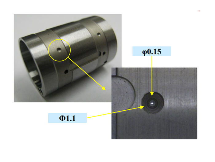 如图所示,需要在不锈钢材质上先钻一个1.1mm小孔,再钻一个0.15mm的通孔,用什么办法加工可以降低成本呢?假如设备是斯大走心机,可以使用2支高频铣动力头BM-322FL来加工,通过机床本身主轴夹持圆柱体固定角度,通过主轴加装动力头进行交替加工。该方案适用于各种小型精密数控车床、CNC加工中心以及机械臂等。只是更换不同的动力头型号而已。